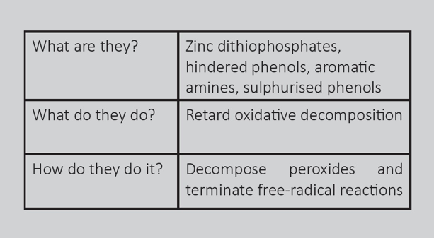 So, now for the start of the show. Antioxidants are used to extend the operating life of your lubricant, and these days, nearly all lubricant formulations contain some kind of oxidation inhibitor in some concentration.